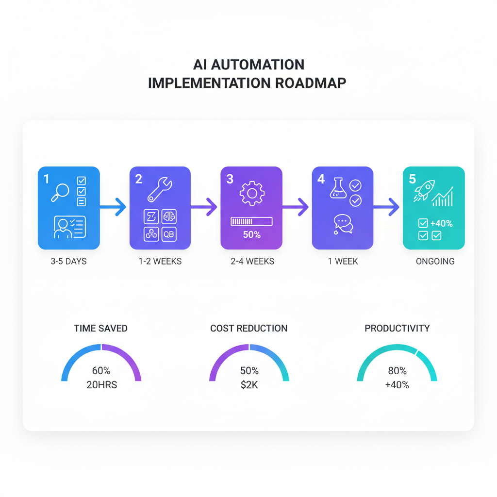 The businesses achieving 40% productivity gains don't automate everything—they automate the right things in the right order with continuous improvement. Start with one high-impact process, prove ROI, then expand systematically. Your 20+ hours of monthly savings await.