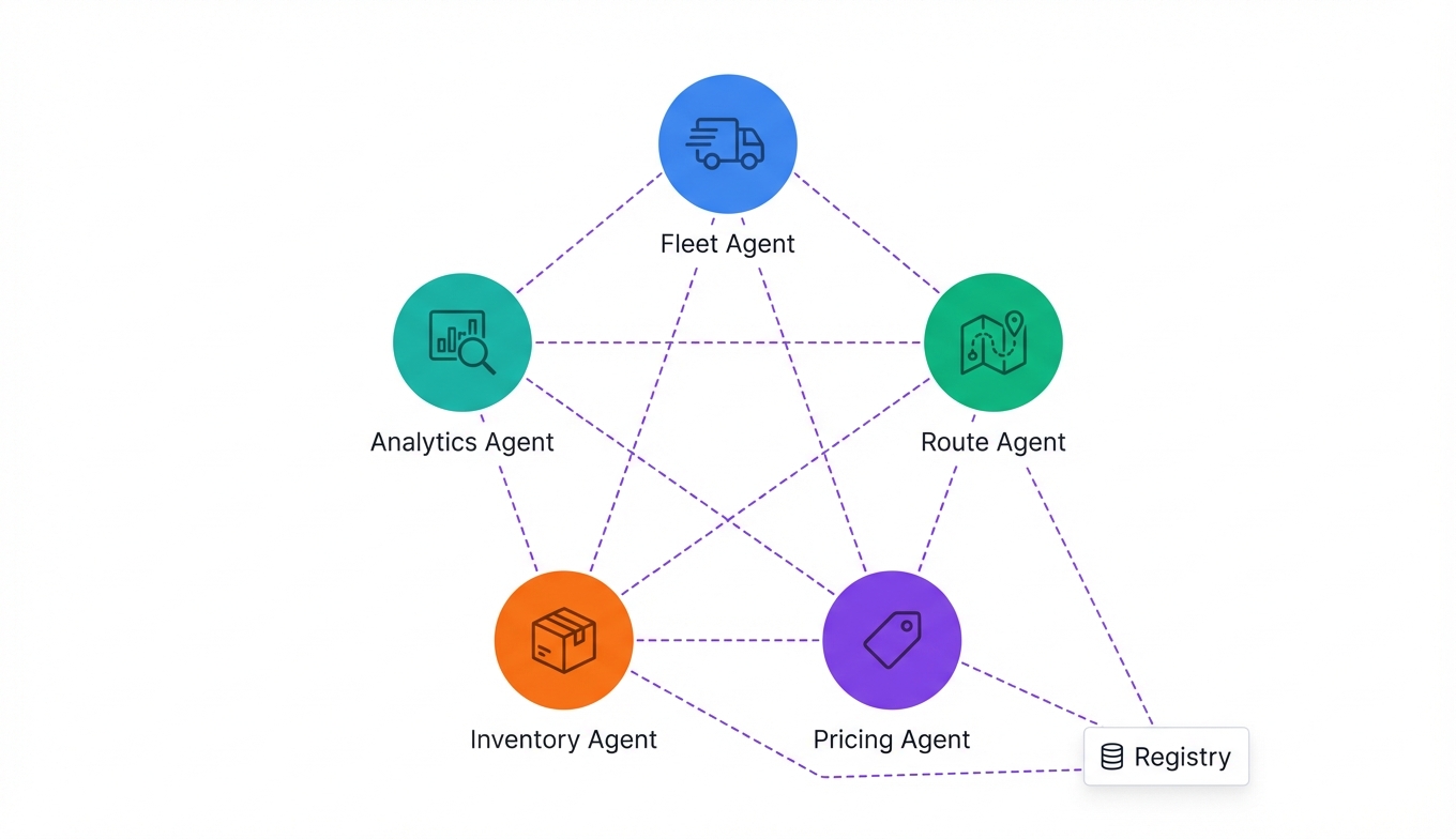 - Agents discover and communicate with peers via service registry